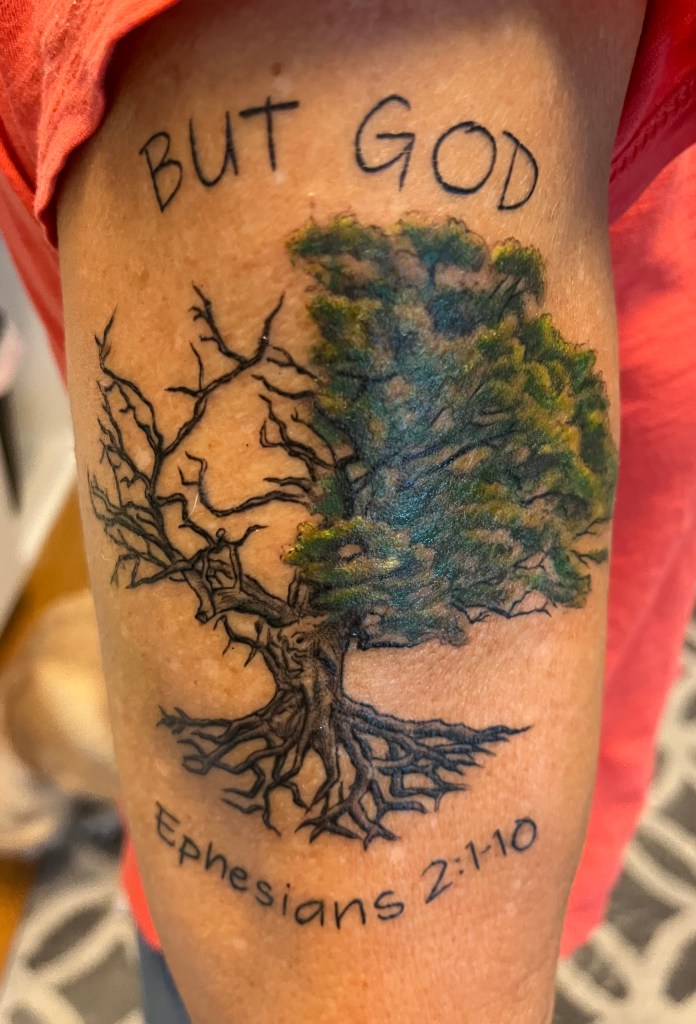 A new illustrative depiction started forming in my mind. It went through many iterations, various church-notebook sketches. But then I landed on something and wasn’t able to let it go. So, now I have a new visual aid on my right upper arm. It is my story. It is the gospel. And it’s all because of the rich mercy and great love of God. Like any good visual aid, it lends to understanding, remembrance, and explanation. And whether or not people ask me about my new tattoo, I pray it gives me the boldness to share its Truth with the multitudes of walking dead around me.
